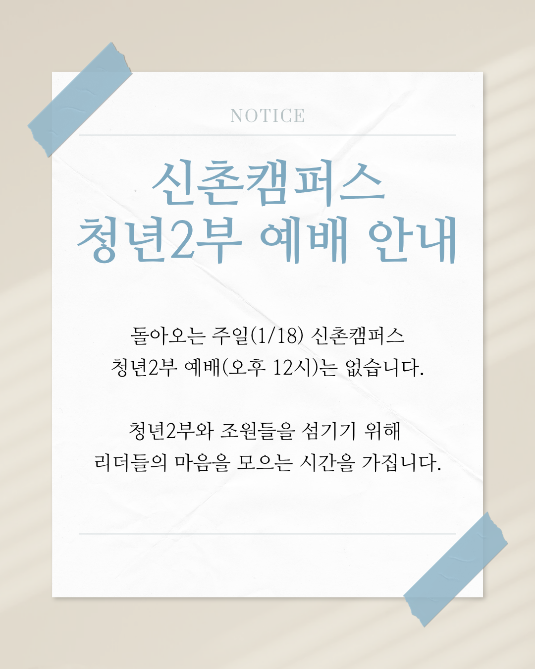 주일 2부 예배 | 오후 12시 | 대예배실 (15F 1502호) |