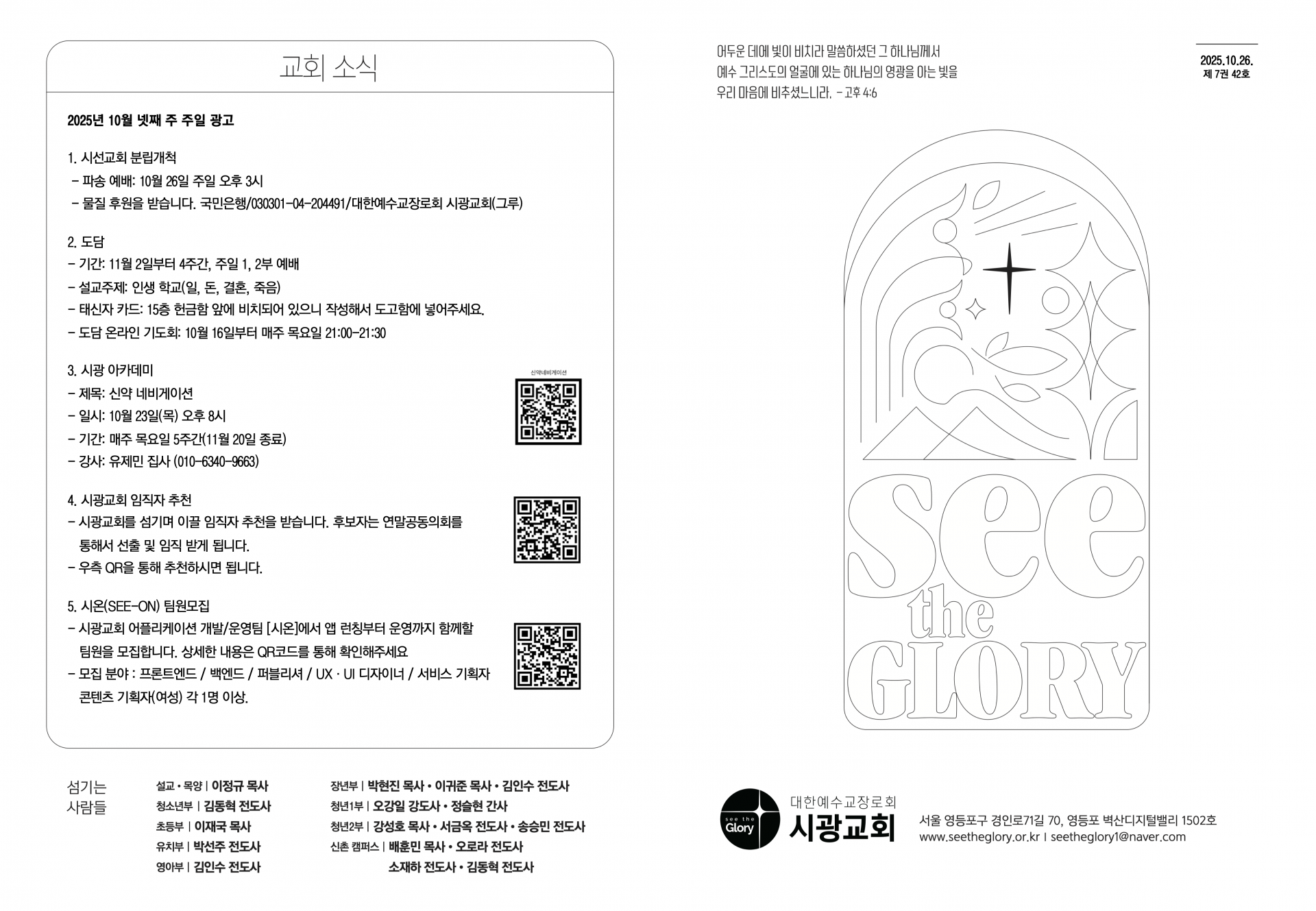 - 오후예배(시선교회 파송예배): 마 5:13-16, 단편, 『산 위의 도시』